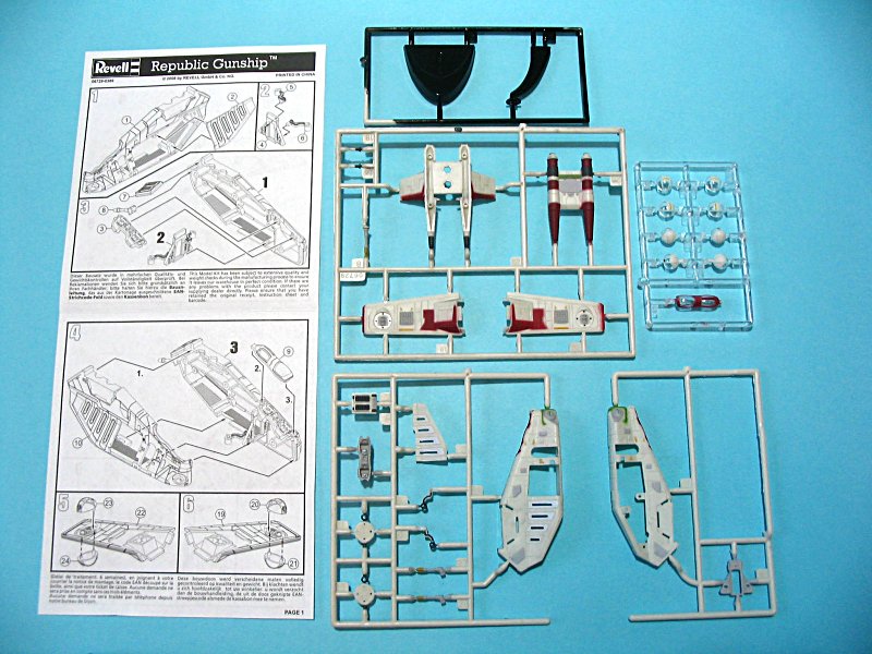 In den Kampfszenen der Clonkriege ist das Gunship recht lange und genau zu sehen, Pilotenkanzel, Innenraum und Bordgeschütze...all dies hat REVELL versucht, trotz der geringen Abmessungen von 9,7x10 cm, so genau wie möglich nachzubilden. Auf jeden Fall ist der Innenraum offen einsehbar und die seitlichen Kanonengondeln sogar beweglich.