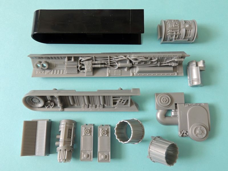 Die gesamte Oberfläche des Speeders ist mit feinen Gravuren und Details versehen und steht Produkten anderer Hersteller damit in nichts nach. Der Bausatz enthält Klarsichtteile für die Windschutzscheibe und die Antriebsdüsen sowie Sticker, der Pilot besteht aus einer Art Hartgummi und ist bereits farbig bedruckt.