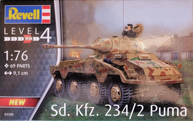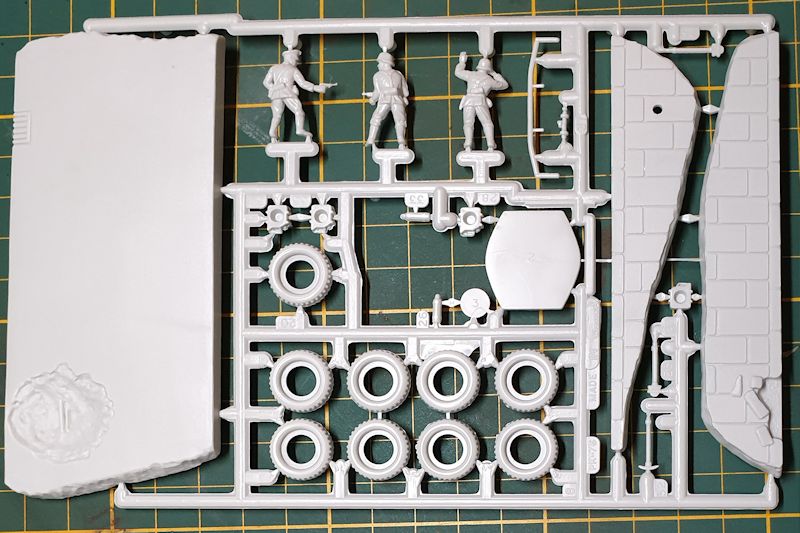 Bausatz: Es handelt sich bei dem Revellbausatz im Level 4 um eine Wiederauflage aus dem Hause Matchbox von 1978. Es liegen zwei Gussrahmen in dem kleinen Karton, welcher aufwendig gestaltet worden ist. Die zwei Gussrahmen beinhalten 69 Teile, inklusive Dioramenplatte und die dazugehörigen Infanteristen.