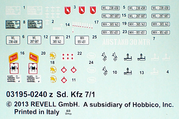 Die Bauanleitung ist, wie bei Revell üblich, in schwarz-weiß gedruckt und sehr übersichtlich. Die Farbangaben beziehen sich auf das Revellfarbsystem, sind aber auch verbal angegeben. Der kleine Abziehbilderbogen ist für die folgenden vier verschiedenen Varianten auf hellblaues Trägerpapier versatzfrei gedruckt.