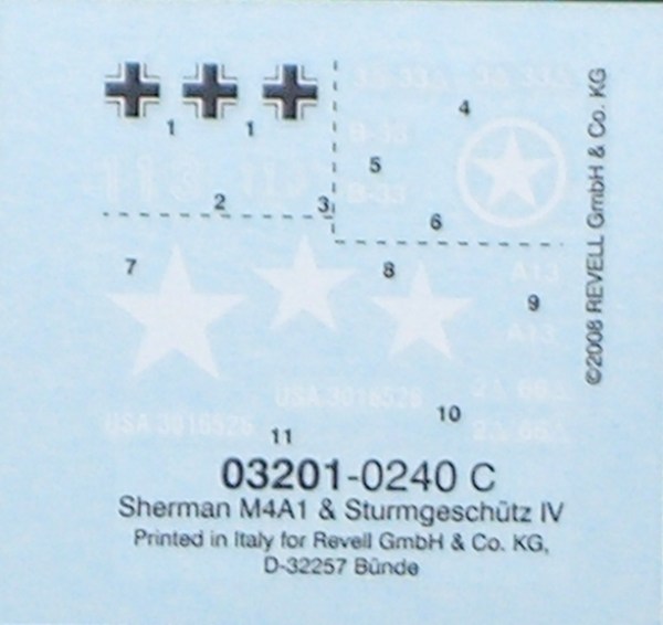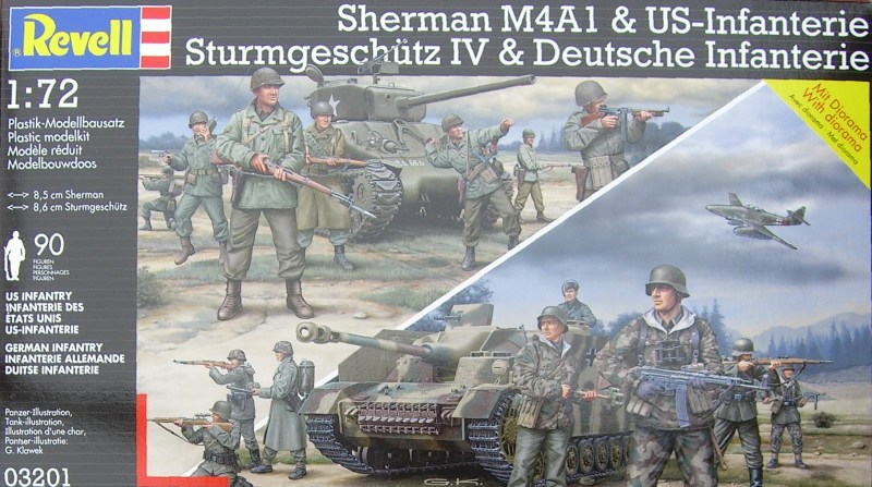 Bausatz: Revell hat hier vier bekannte Bausätze zu einem Set zusammengefügt. So gibt es hier das StuG IV, welches nur auf dem ersten Blick den Ansprüchen von ernsthaften Modellbauern genügt, und den Sherman M4A1. Dazu kommen noch zwei Sets mit Weichplastik-Figuren. Das alles soll auf einer gut gemachten Vacuplatte aufgebaut werden. Anregungen dafür gibt das Bausatzcover.