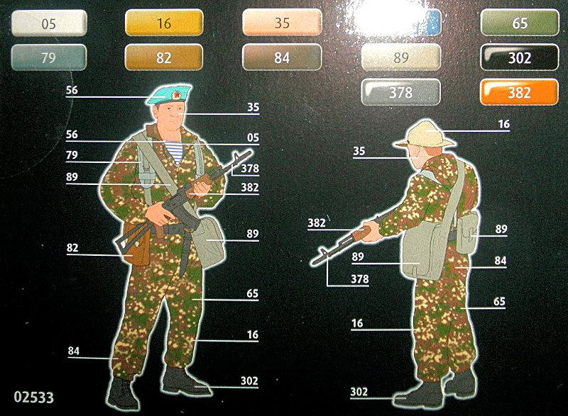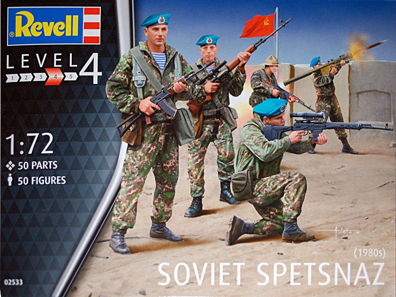 Vor kurzen hat Revell sein Sortiment um Figuren der Spezialeinheit des sowjetischen militärischen Nachrichtendienstes GRU (Spetsnaz) erweitert. Die hellbraunen Weichplastikfiguren sind in verschiedenen Posen dargestellt, einige kämpfend, andere nicht kämpfend. Die Positionen sind stehend, laufend oder knieend. Auch sind verschiedene Bewaffnungen enthalten (AK-47, Scharfschützengewehr oder Strela Luftabwehrrakete. Die Figuren haben des weiteren verschiedene Kopfbedeckungen.