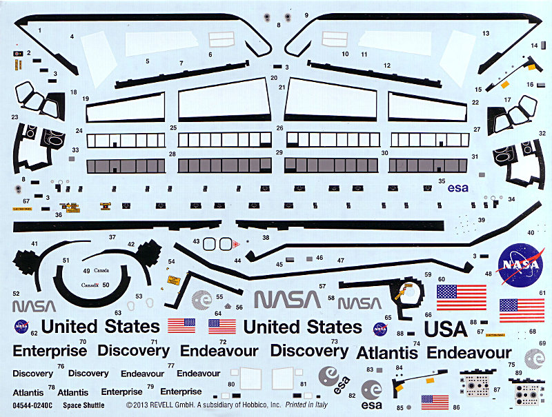 Die Decals wurden schon zuvor veröffentlicht, sind sehr detailreich und ermöglichen folgende Varianten des Space Shuttle: Discovery, Enterprise, Endeavour und Atlantis vor 1998 sowie der Raumfähren Atlantis, Discovery und Endeavour nach 1998.