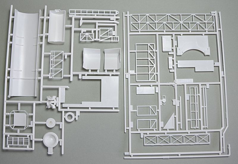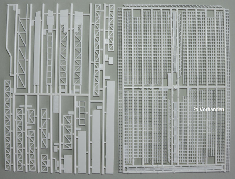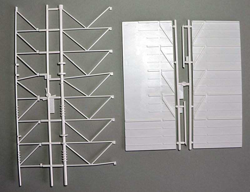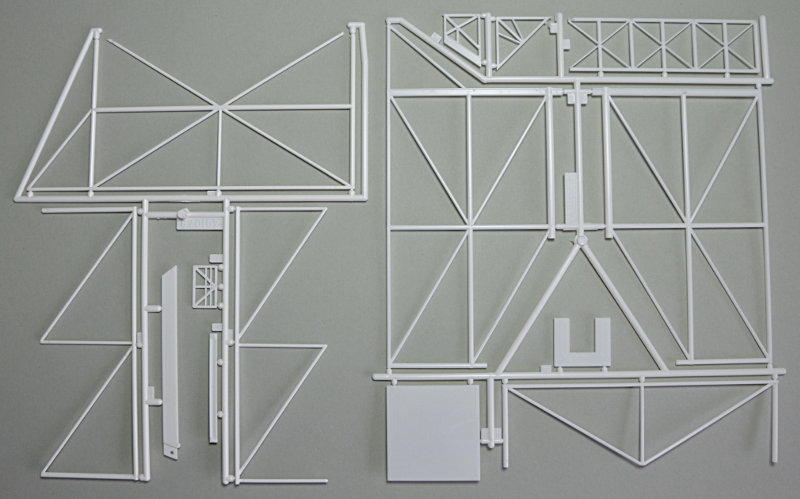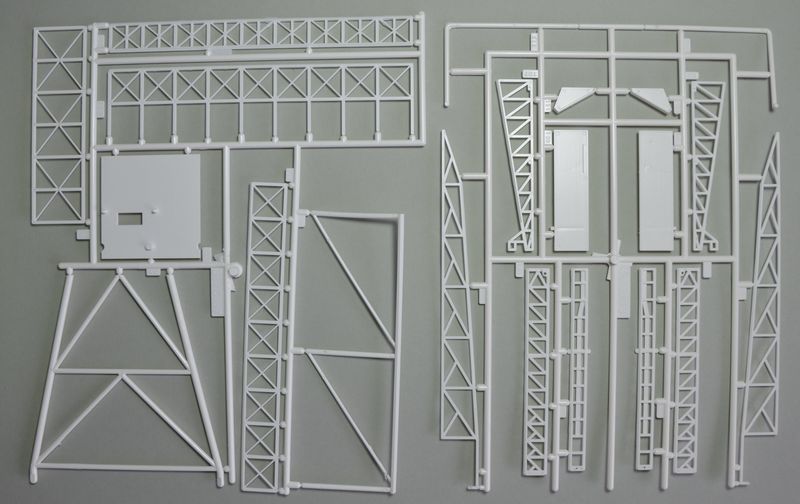 Launch Tower: Viele Teile, Gitterstrukturen und nach der Montage bewegliche Objekte machen den Bausatz aus. Ein zwei Mal vorhandener Rahmen mit endlosen Reihen von Geländern gehört auch dazu, welche eigenständig für ihre jeweilige Position passend abgelängt werden müssen.