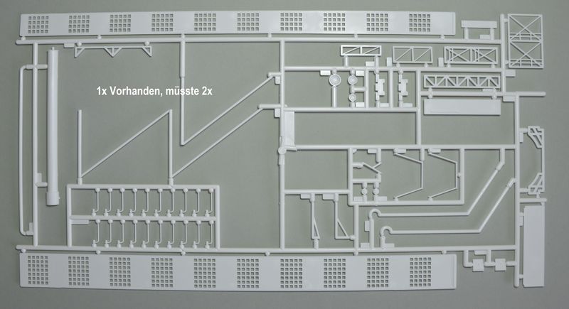 Allerdings fehlt bei meinem Exemplar der zweite Spritzrahmen 04910/12, der auch nicht als zwei Mal vorhanden in der Teileauflistung vorkommt. Dummerweise kann man den Aufzug ohne diesen Rahmen nicht bauen. Hoffe ich bin ein Einzelfall, ansonsten bitte an Revell wenden.
