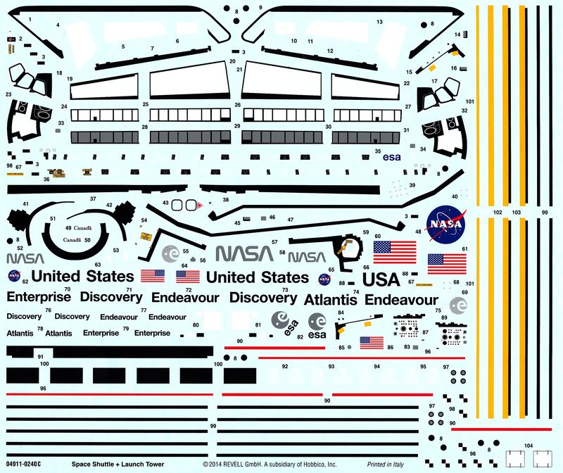 Die Decals: Der schon bekannte Decals - Satz für das Space Shuttle wurde mit ein paar Decals für den Launch Tower erweitert. Man kann alle Shuttle Versionen bauen, exakte Unterschiede zwischen den Shuttles werden deutlich in der Bauanleitung herausgehoben. Wenn man klug ist und die richtige Bemalung wählt, dann bleiben sogar eine „Flagge“ und ein „USA“ übrig, die in die Arbeitsbühne des Towers gehören. Eigentlich hätten die extra dabei sein müssen. Noch so ein Mysterium. Challenger und Columbia wären somit dafür als Shuttle-Variante gestorben. Oops.
