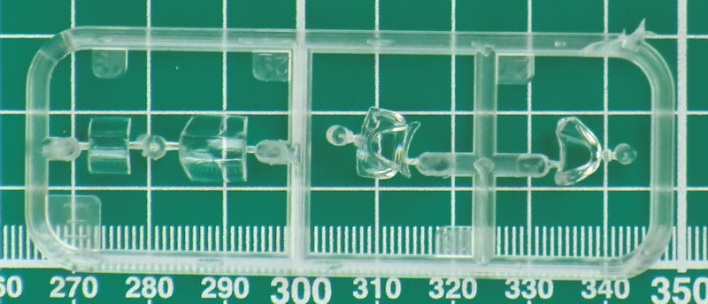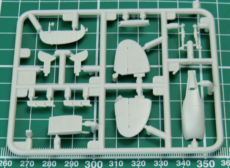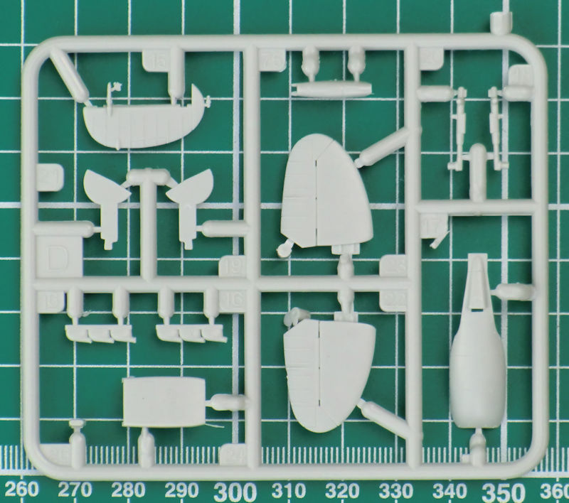 Die Tragfläche ist samt Fahrwerksschächte sehr gut gestaltet. Alle Auswerferöffnungen sind an passender Stelle vorhanden. Revell hat bei den Rudern für scharfe Hinterkanten gesorgt. Das ist sehr gut! Bei den Hauptfahrwerksrädern kann man zwischen den Ausführungen mit vier oder fünf Speichen wählen. Bei der Frontverglasung gibt es ein Alternativteil. Leider sagt die Bauanleitung nichts darüber aus welches verbaut werden soll.