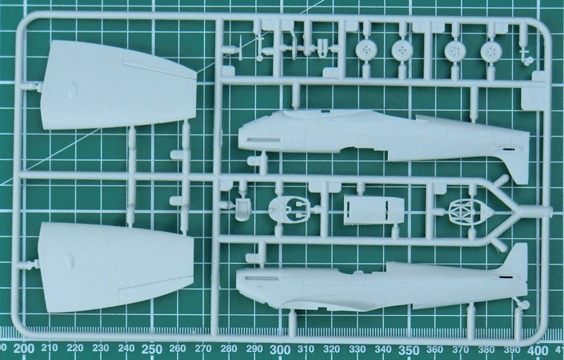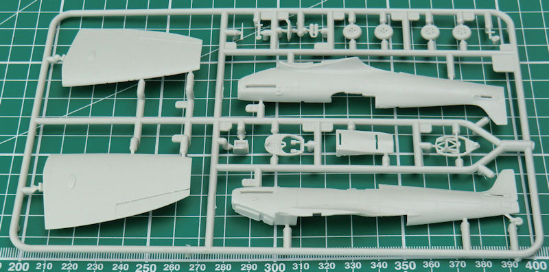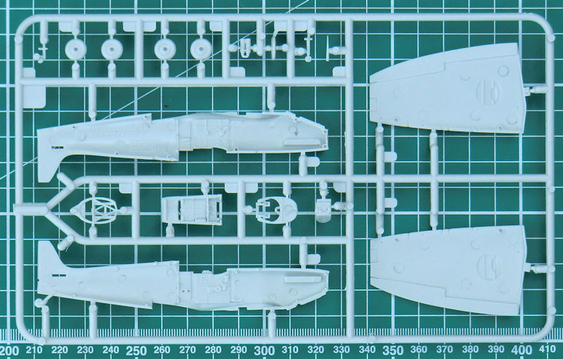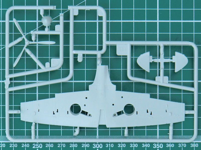 In der attraktiven unpraktischen Revell-Schütt-Box befinden sich gut verpackt drei milchweiße Spritzlinge mit insgesamt 34 Einzelteilen, ein klarer Spritzling mit vier Teilen, ein Decalbogen und die mehrfarbige Bau- und Bemalungsanleitung. Bei letzterer vermisse ich nach wie vor ein paar Informationen zum Vorbild. Die Abspritzung der Bauteile und deren Detaillierung ist voll auf der Höhe der Zeit. So gibt es feine versenkte Strukturen. Auch wenn die Zahl der Bauteile sehr gering erscheint, hier gibt es schöne Details und das Cockpit ist recht üppig detailliert. Selbst Sitzgurte gibt es als Decal.