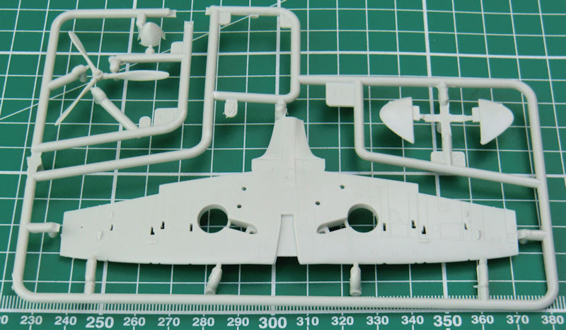 Entgegen der Bauanleitung findet man an dem Bauteil an dem das Instrumentenbrett befestigt ist auch die passenden Seitenruderpedale. Die Strukturen sind erhaben und so kann man die Instrumente bemalen oder mit Hilfe von Weichmachern ein Decal aufbringen. Gelungen sind auch die Rumpfinnenseiten. Leider ist die Einstiegsklappe nicht einzeln vorhanden. In der Bauanleitung fehlt dazu auch noch die Gravur.