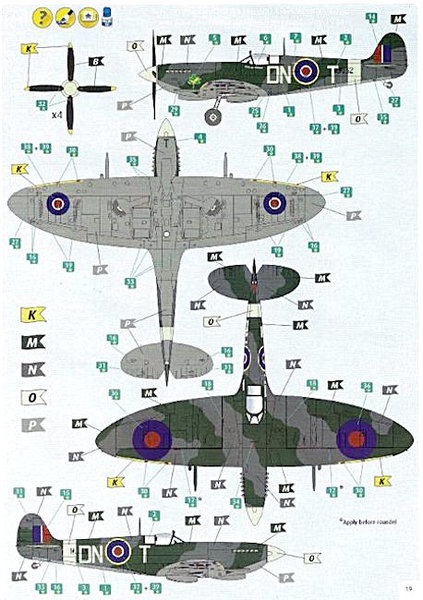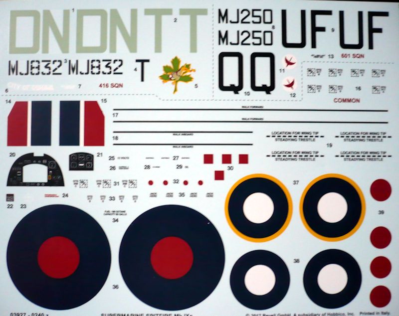 Die transparenten Teile wirken ebenfalls gut gelungen. Leider ist das ovale Schiebefenster der Canopy-Haube nicht dargestellt. Hier muss dementsprechend nachgraviert werden. Über eine Motorennachbildung verfügt das Modell nicht, jedoch ist der Propeller beweglich. Die Spitfire verfügt über separate Steuerflächen und man kann zwischen einem frühen und einem späten Leitwerk wählen. Das Fahrwerk ist ebenfalls sehr ordenlich wiedergegeben. Die Bereifung ist leider nicht abgeflacht. Der Flieger lässt sich im Stand und in der Luft darstellen. Über einige Details wird man in der Bauanleitung im Dunkeln gelassen, wie z.B. die Bestückung der Bomben für die jeweiligen Vorbilder. Dieselbe Frage stellt sich bei den Abgasrohren. Zur Verfügung stehen die standardmäßigen rundlichen und die fischflossenförmigen Rohre. Hier ist man auf Recherche angewiesen.