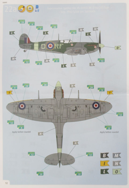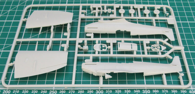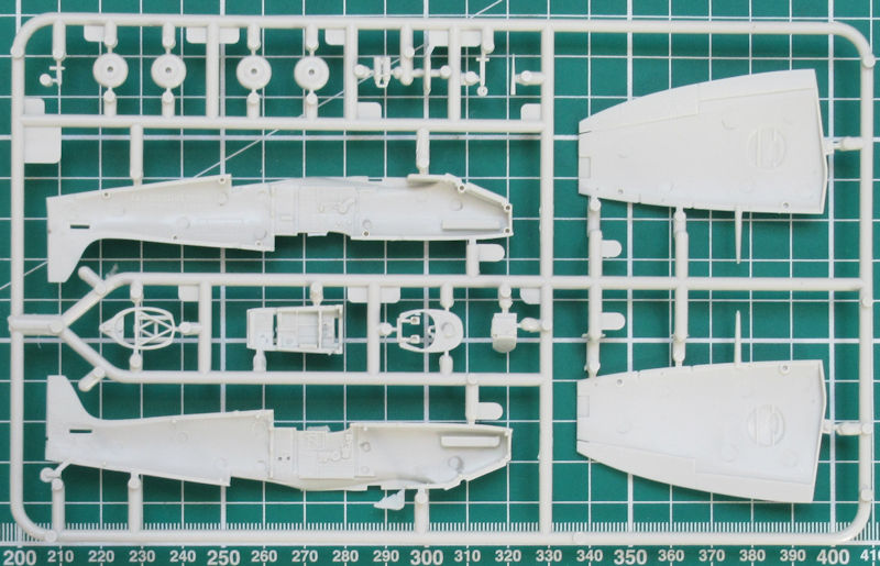 Die Bauteile sind nach wie vor auf der Höhe der Zeit. Es gibt feine versenkte Strukturen und schöne Details. Gegenüber der Mk. II wurde ein kleiner Spritzrahmen mit einer anderen Luftschraube samt Spinner sowie zwei verschiedenen Rumpftanks hinzugefügt. Diese sollen zwar später alternativ genutzt werden aber ob Jan Zumbachs Maschine damit ausgerüstet das weiß ich nicht. Aber auch die Tragfläche wurde für die veränderte Bewaffnung modifiziert.