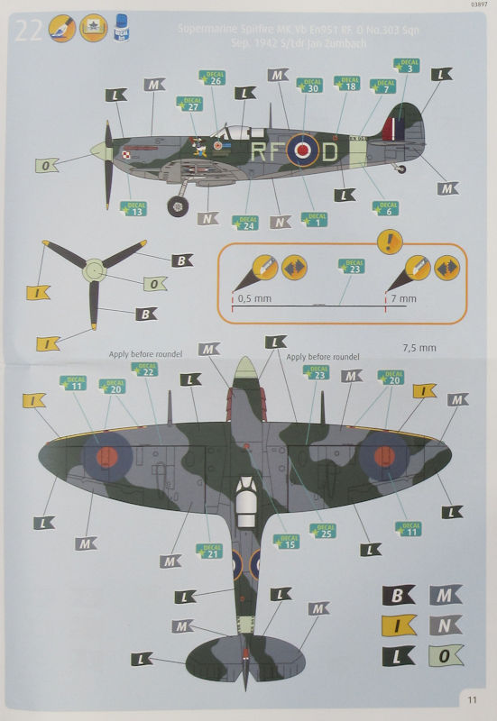 Die Spitfire Mk. V war die am häufigsten produzierte Version der Spit. Es entstanden 94 Mk. Va mit acht MGs, 3923 Mk. Vb mit zwei Kanonen und vier MGs und 2447 Mk. Vc mit zumeist vier Kanonen oder zwei Kanonen und vier MGs.