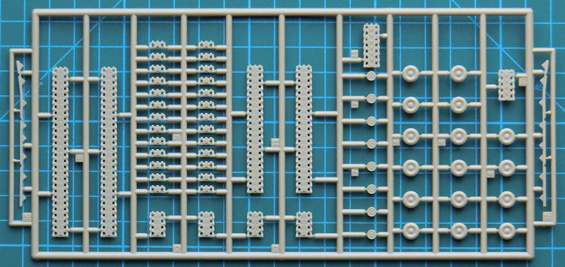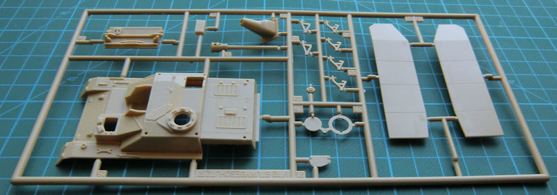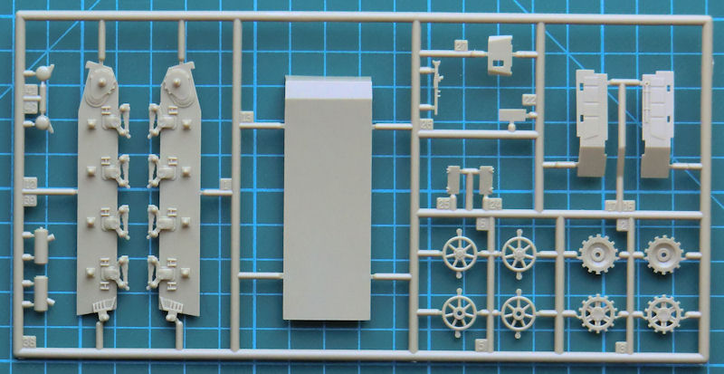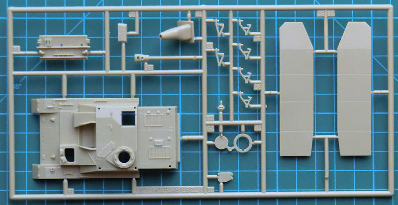 In der attraktiven unpraktischen Revell-Schüttbox befinden sich gut verpackt drei beige Spritzlinge mit 101 Bauteilen, einen kleinen Decalbogen und die typische umfangreiche Revell-Bauanleitung. Der Bau geht anhand der Anleitung schnell von der Hand, denn das vereinfachte Fahrwerk hat hier Vorteile. Die Kette besteht aus Segmenten und das vereinfacht auch den Bau. Dafür kann man die Kette mit normalen Kunststoffkleber verarbeiten.