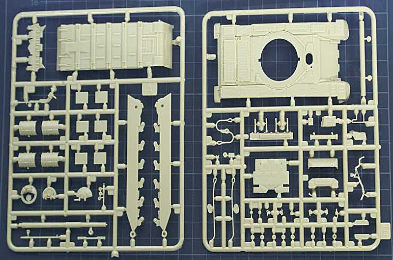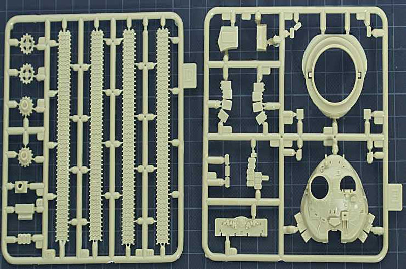 Die Spritzlinge weisen keine Grate auf und die Gravuren vom Turm und Wanne sind sehr fein dargestellt. Die Ketten sind in vier Segmente eingeteilt und man muss diese mit Warmen Wasser um die Laufrollen biegen, eine gute Idee aber der Nachteil ist sollte es einmal nicht funktionieren liegt leider kein Ersatz bei. Turm ist drehbar und man kann die Turmluken wahlweise offen oder geschlossen darstellen.