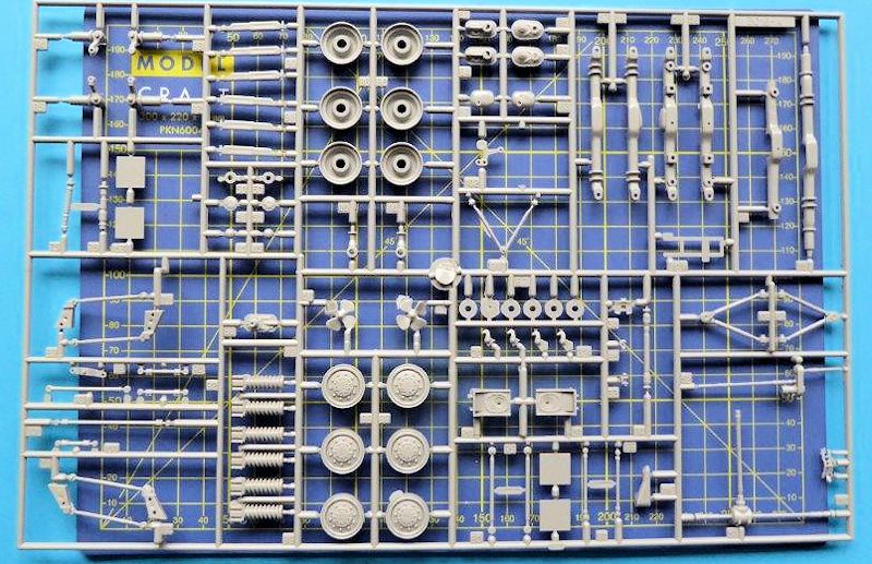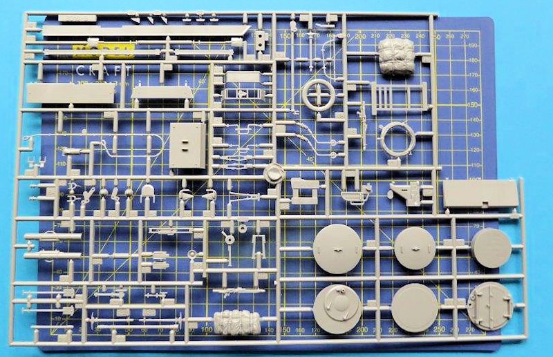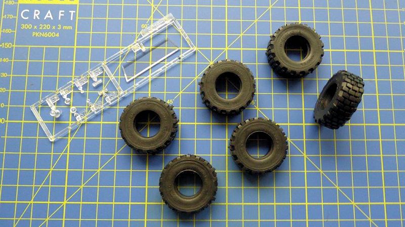 Bausatz: Bei diesem Modell handelt es sich um eine Wiederauflage. Der Grundbausatz kam 1998 das erste Mal in den Handel. In der Revell typischen Schüttbox im jetzt schon bekannten neuen Kartonlayout mit Level 4 Angabe, befinden sich drei hellgraue und ein Klarsichtrahmen mit der Windschutzscheibe sowie den Teilen für die Beleuchtung. Einzig die sechsteilige Bereifung erfuhr eine Überarbeitung. Die Vinylreifen weisen ein gut herausgearbeitet Stollenprofil auf. An den Reifenflanken findet man auch die passende Beschriftung was bei Revell eigentlich nicht üblich ist (Lizenzgebühren).