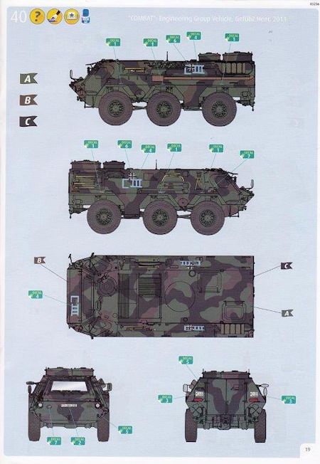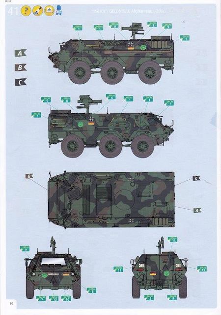 Der Fuchs kann in zwei Varianten (Rüstsätze) gebaut werden. Mit der Panzerabwehrwaffe Milan auf dem Fahrzeugdach oder als Pioniergruppenfahrzeug. Die leicht verständliche farbige Bauanleitung verhilft in 39 Bauabschnitten zum fertigen Modell. Auf dem Deckblatt befindet sich noch ein Stück Draht für die Antenne.