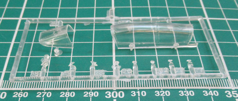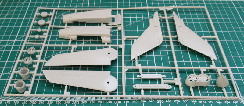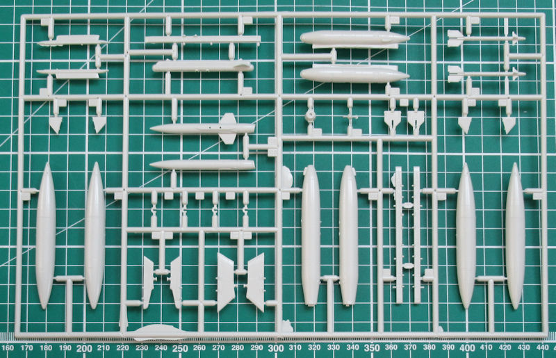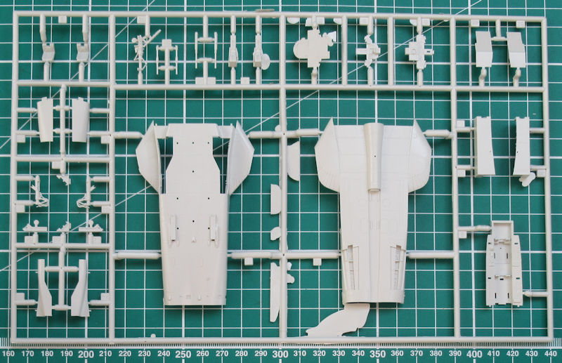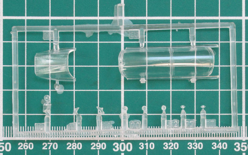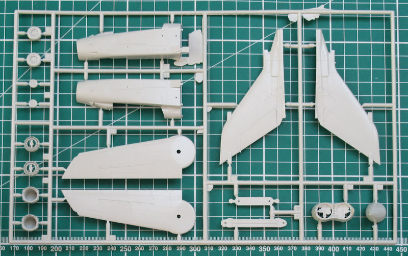 In der attraktiven aber unpraktische Schüttbox befinden sich sehr gut verpackt fünf hellgraue Spritzgussrahmen mit 145 Teilen, ein klarer Rahmen mit zehn Teilen, ein großer Decalbogen und die mehrfarbige Bau- und Bemalungsanleitung. Die Form war bei meinem Bausatz offensichtlich nicht so optimal eingestellt und so findet sich an einigen Bauteilen Grat. Ansonsten findet man feine versenkte Strukturen und damit ist der Bausatz durchaus noch auf der Höhe der Zeit.