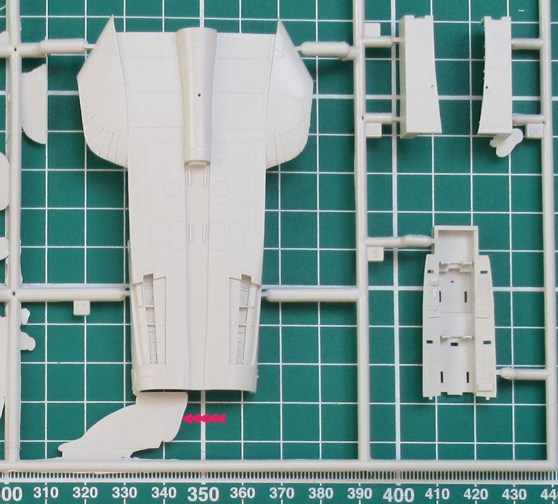 Bevor der Rumpfbug angeklebt wird sollte man keinesfalls die 10 Gramm Gegengewicht vergessen. Die Bugfahrwerksklappen müssen selbst geteilt werden. Innen haben die Fahrwerksklappen schöne Strukturen. Alternativ kann die Nachtankeinrichtung ausgeklappt oder eingefahren angebaut werden.