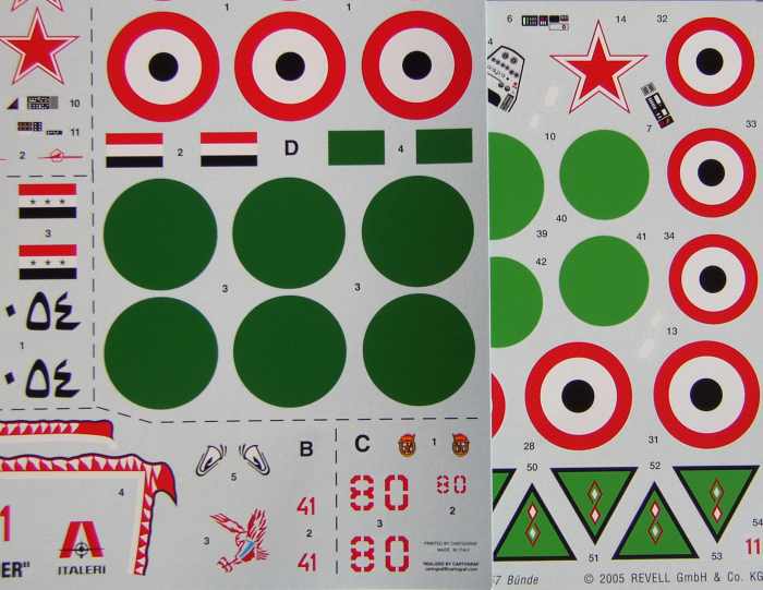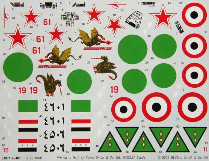 Im Gegensatz zum Backfire-Bausatz gleichen Ursprungs, hat der Konstrukteur die Formen und Poportionen des Originals recht gut getroffen. Die Bauanleitung verdient ihren Namen und es ist wohl die beste Ausführung, die bisher dem Bausatz beilag. Auch die Bemalungsanleitungen sind vorbildlich und in einer vernünftigen Größe. Leider liegt eine korrekte Nachtanksonde, die die späten Maschinen der Sowjetunion (sowie später Russlands und der Ukraine) hatten nicht bei. Bei den letzten beiden Bemalungsvarianten gehören sie einfach dazu. Ein weiteres Problem, so finde ich es jedenfalls, ist das Grün der moslemischen Länder bei den Decals. Ich finde es schlichtweg zu hell. Falls jemand den originalen Farbton bestimmen kann, würde ich mich über eine Information freuen. Deswegen habe ich mal das Italeri-Decal zum Vergleich daneben gelegt.