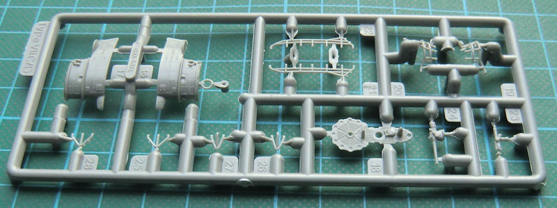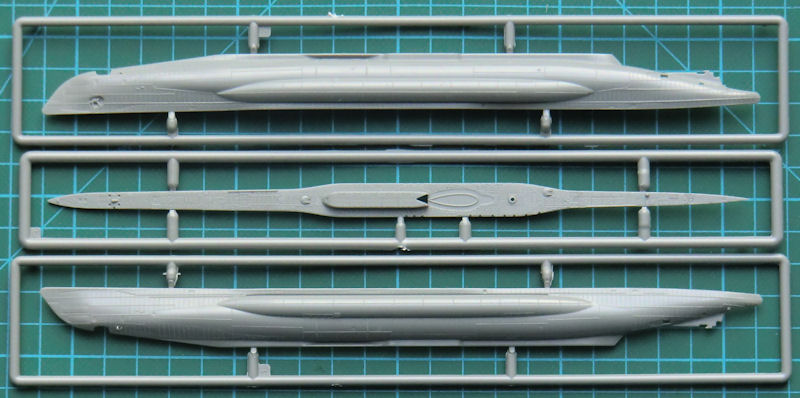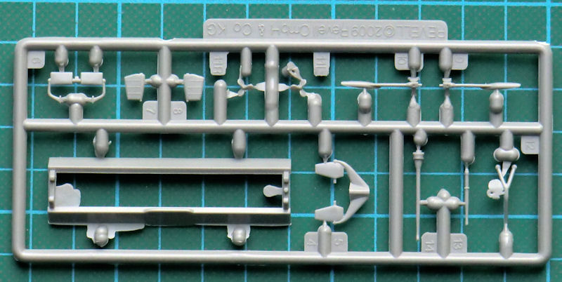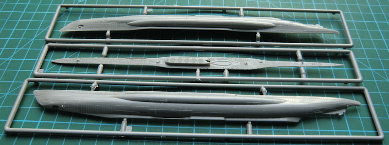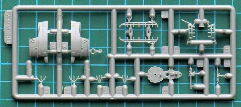 In der typischen unpraktischen Schüttbox befinden sich gut verpackt fünf graue Spritzlinge mit 28 Teilen, ein kleiner Decalbogen und die Umfangreiche Bauanleitung. Die Bauteile sind voll auf der Höhe der Zeit und Grat ist kaum zu finden. Es gibt eine erhabene Nietenstruktur. Das Deck besteht aus einem Teil und ist mit einer phantastischen Struktur versehen.