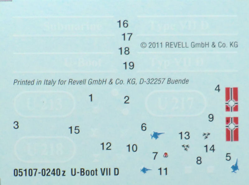 Ohne sichtbarem Versatz ist der kleine Decalbogen auf hellblauem Trägerpapier gedruckt. Die Farbangaben sind für das Revell-Farbsystem.