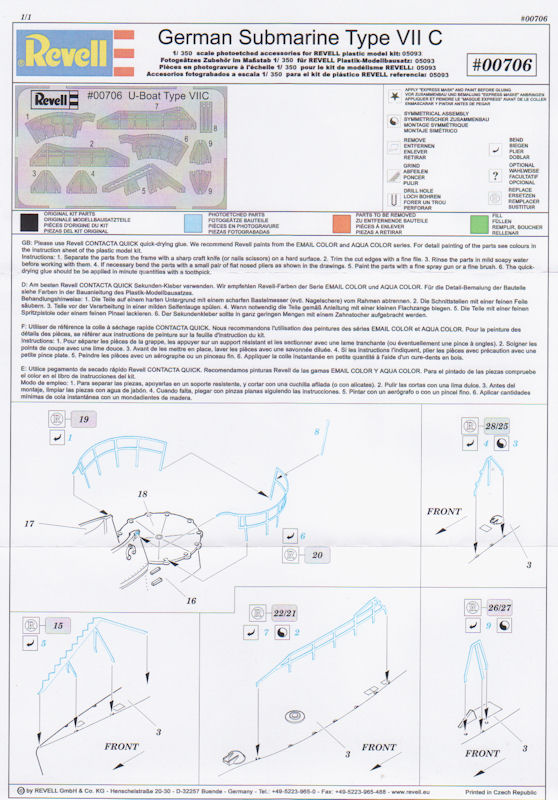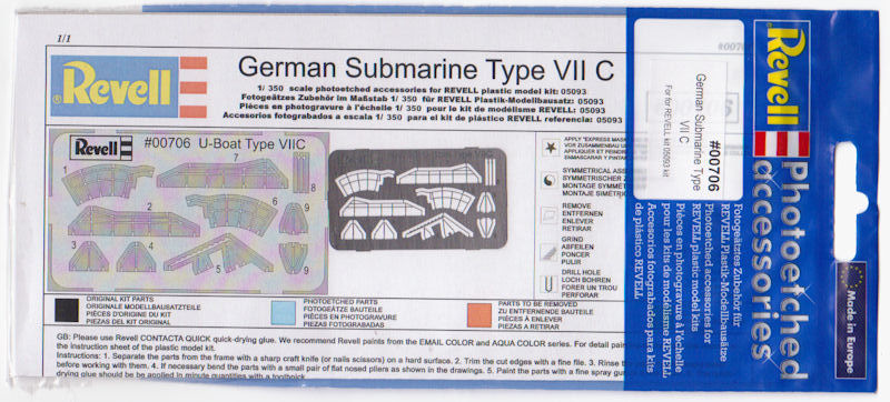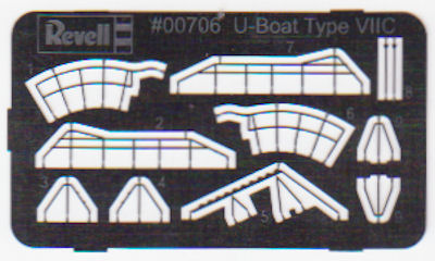 Für den 2009 erschienenen Bausatz des Typ VIIC-U-Bootes in 1/350 hat Revell jetzt ein Set Fotoätzteile herausgebracht. Es enthält Teile für die Reling, ein paar Kleinteile und den Kabelschneider. Das Set ist sehr klein und kann preislich mit dem Bausatz locker mithalten.