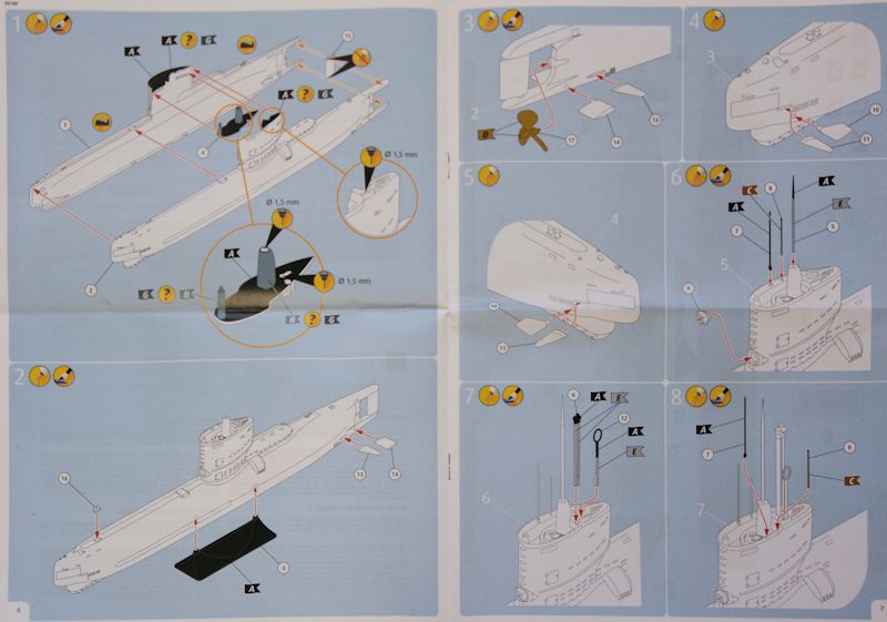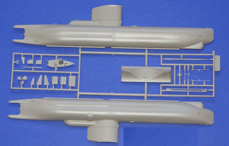 Die Bauteile sind sauber und fast ohne Grat aus grauem Plastik gegossen. Die Bauteile für den Rumpf sind mit schönen Oberflächendetails graviert. Die Sehrohre, Antennen usw. sind sehr fein gegossen und Vorsicht ist beim Abtrennen geboten. Sonst besteht das Risiko, dass man sie abbricht.