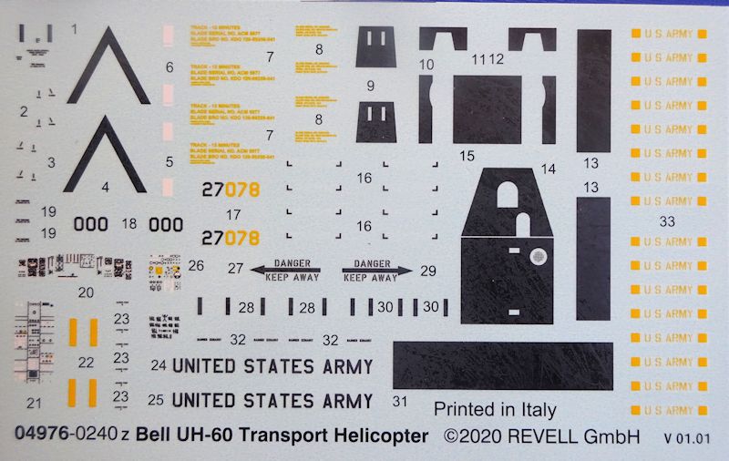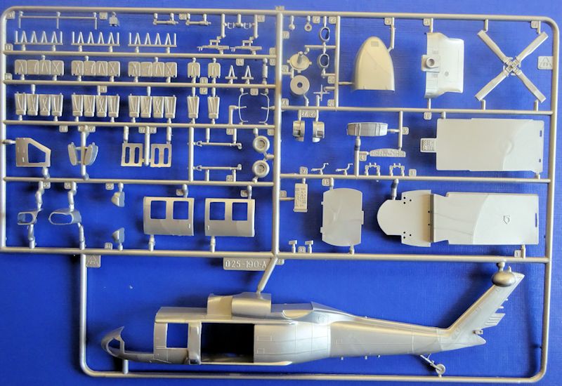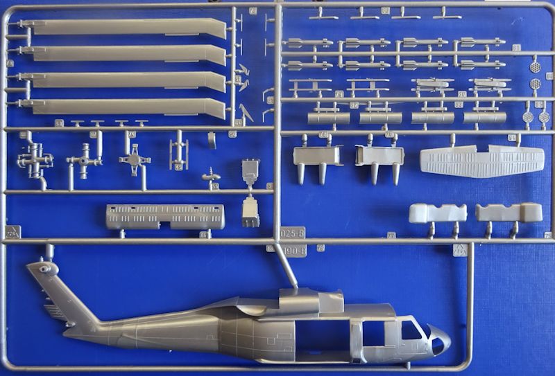 Bausatz: Alle Jahre wieder erscheint der 1991er Italerie Black Hawk auch bei Revell. Bei dieser Ausgabe gibt es für den Sikorsky UH-60 eine neu dekorierte revelltypischen Schüttbox. In dieser befinden sich zwei gut verpackte silbergraue Gussäste mit 128 und nicht wie auf der Schachtel angekündigten 185Teilen, einer mit 11 Klarsichtteilen, ein Abziehbilderbogen und die Bauanleitung. Die Detaillierung ist gut aber die erhabenen Strukturen entsprechen nicht mehr den heutigen Ansprüchen an ein Spitzenmodell.