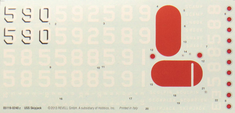 Bausatz: Nachdem im vergangenem Jahr bei Moebius die Skipjack-Class im Maßstab 1/72 erschien, waren viele Modellbauer erstaunt und zugleich auch begeistert. Die Freude ist jetzt auch groß, dass Dank Revell dieser Kit auch in Europa gut verfügbar ist. In dem stabilen aber viel zu großen(Preiskategorie?) Stülpkarton befinden sich gut verpackt 51 Spritzgussbauteile, fünf Klarsichtteile, vier Metallteile, ein Decalbogen und die typische umfangreiche Bauanleitung von Revell.
