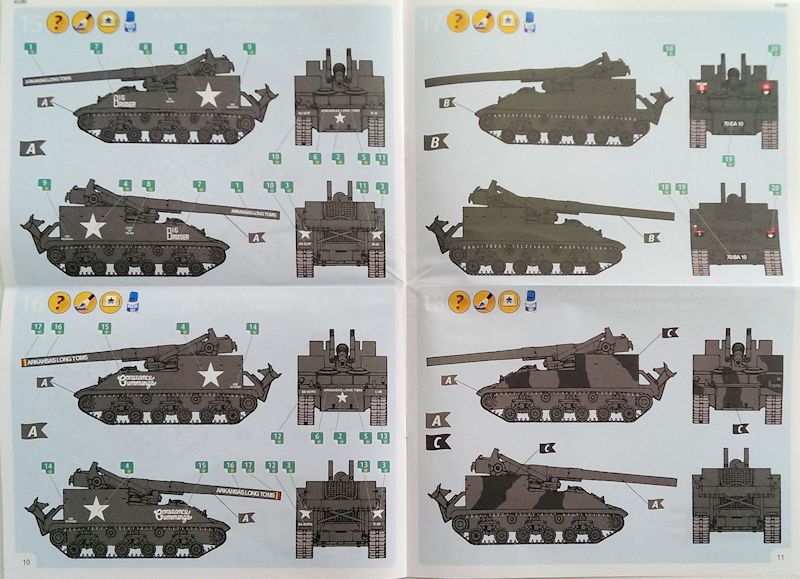 Bauanleitung/ Bemalung: Die Bauanleitung umfasst 11 Seiten, ist übersichtlich und leicht verständlich. Es gibt vier verschiedene Bemalungs- und Gestaltungsvorschläge. Der Bogen mit den Abziehbildern ist eher klein, aber auch ausreichend für das Fahrzeug in diesem Maßstab. Bei den Abziehbildern kann man zwischen der amerikanischen und britischen Armee wählen.