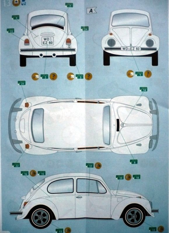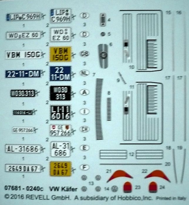 Bemalung: Der Abziehbilderbogen ist sauber gedruckt und erlaubt u.a. den Bau der auf dem Kartondeckel gezeigten Version. Dafür gibt es diverse Kennzeichen (D, F, NL, A, CH, GB, I, E).