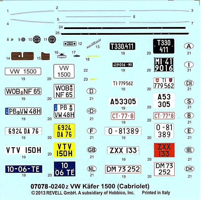 Geliefert wird der neue Bausatz in der Revell bekannten Side-Open-Box mit einer wie immer sehr guten Auto-Illustration. Der Bausatz beinhaltet ca.122 Bauteile die in weiß, grau, klar und Chrom abgespritzt sind. Ferner finden sich 4 Gummi Reifen und die bekannten sehr guten Decals in der Box. Dank der 16 –seitigen, sehr übersichtlichen Bauanleitung (mit ausführlichen Farbangaben) dürfte der Zusammenbau dem Anfänger, wie auch dem fortgeschrittenen Modellbauer keine Schwierigkeiten bereiten. Erwähnenswert bei diesem Bausatz ist die Beigabe von Decal Zierstreifen für die seitlichen Chromleisten an der Karosse und für die schwarzen, mittigen Bereiche der Stoßstangen. Sehr gut wiedergegeben ist der Luftgekühlte 1500 VW Motor mit seinen Aggregaten. Auch die optionale Anbringung einer Anhängerkupplung und eines geschlossenen Verdecks mit Seitenscheiben am Modell gefällt mir sehr gut.