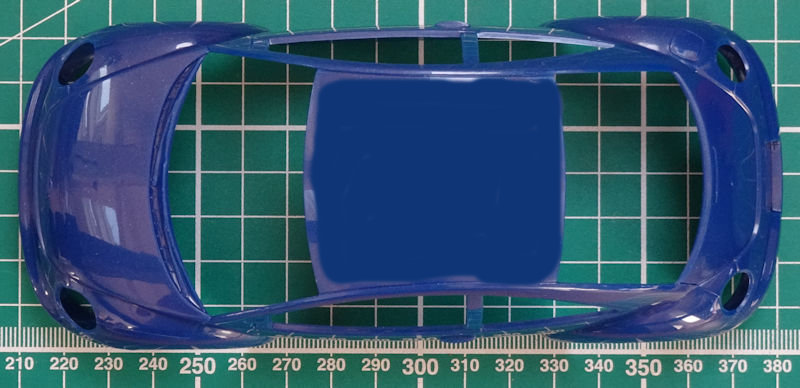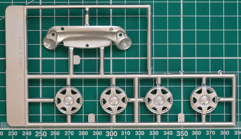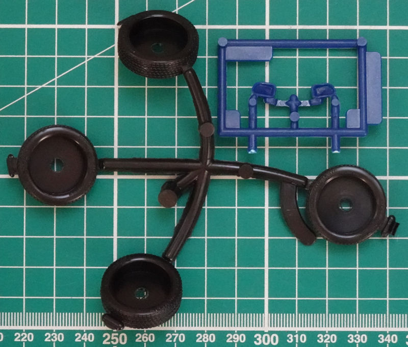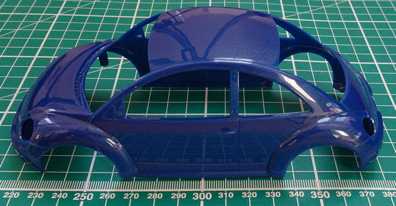 Die blaue Karosserie ist extra gepackt und es gibt insgesamt 9 Spritzlinge. Zusätzlich gibt es 4 Räder, 2 Achsen und 4 Schrauben. Somit sind es insgesamt 35 Teile. Die Spritzlinge sehen sehr gut aus. Ein Grat ist nicht auszumachen Es gibt keine verchromten Teile. Daher wirkt der ganze New Beetle auf mich sehr bieder. Ich bin gespannt, wie gut er sich zusammen bauen lässt.