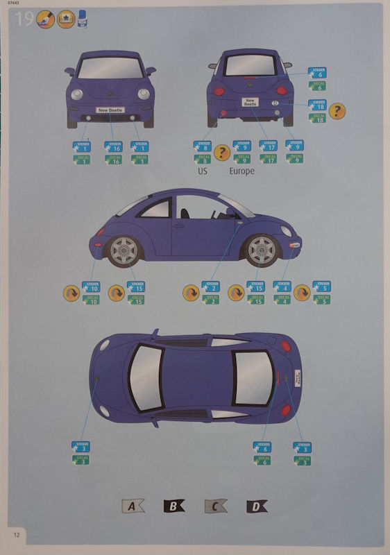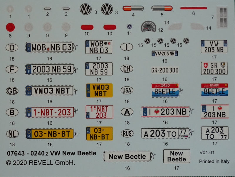 Wieder zurück zum Bausatz. Mir gefallen die Haptik und die kleine Anzahl der Teile. Es gibt wieder die Varianten entweder Decals oder Sticker zu verwenden. Das finde ich gut. Sogar bei den Kennzeichen kann man wählen, 10 Länder...wow eine gute Idee.