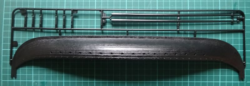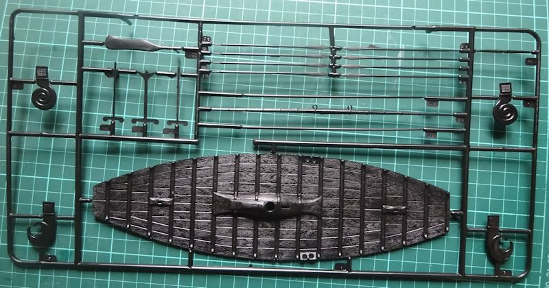 Das Deck, die Stevenzier, die Rahe, das Ruder, weitere Riemen sowie einige Kleinteile befinden sich am vierten Gussast. Die Holzgravuren sind sehr schön.