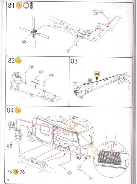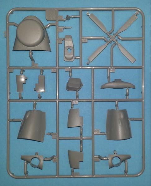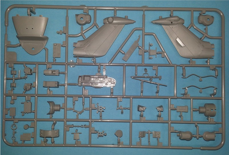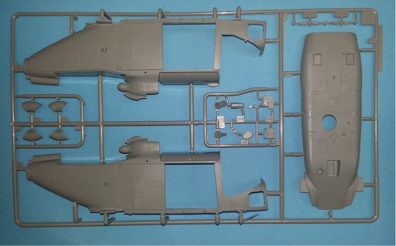 Nach der Hochzeit der großen Rumpfteile wird anschließend das Motordeck mit dem Hauptgetriebe und den Turbinenein- und ausläsen aufgebaut. Dem Thema der dreidimensional geformten Schutzgitter von den Einläsen nähert sich Revell mit Hilfe von Bauteile aus durchsichtigen Kunststoff. Ätzteile sind hier auch nicht automatisch eine Hilfe, da sie auch erst die recht komplexe Form annehmen müssten. Hier könnten evtl. die Bausatzteile beim Abformen helfen. Der FLIR-Turm kann beweglich gebaut werden. Zur Darstellung der Optikfläche soll ein Decal verwendet werden. Klarsichteile werden hier nicht verwendet.
