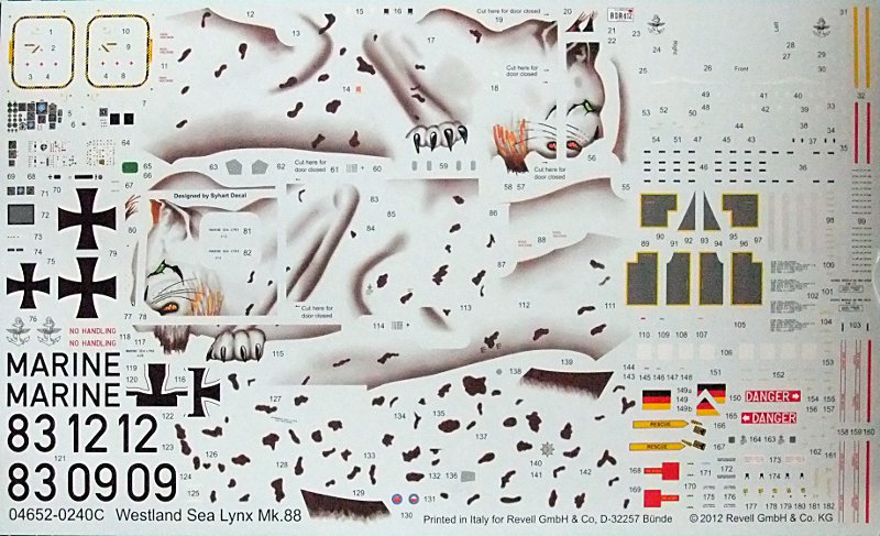 Um den Körper der stilisierten Raubkatze auf den Rumpf des Helikopters auch hinzubekommen, sind in der Revell-Typischen Bauanleitung Schablonen zum ausschneiden enthalten. Damit lassen sich die Begrenzungen anzeichnen, zwischen denen dann der Tierkörper, in Orange-Gelb lackiert werden muss.