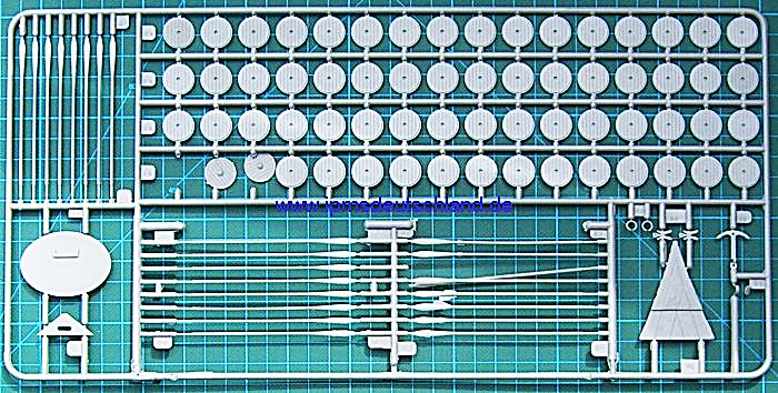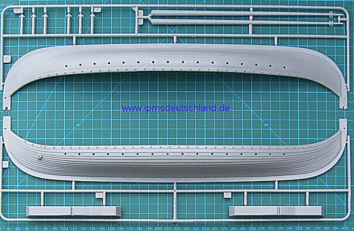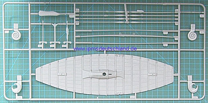 Bausatz: Hierbei handelt es sich auch um einen Testshot, der auch nicht ganz vollständig ist. Es ist allerdings keine Neuentwicklung, sondern vor über 25 Jahren erschien dieser Bausatz zuletzt. Durch den relativ großen Maßstab (1/50) sind auch Details sichtbar. Mir persönlich gefällt die vorbildgerechte Überlappung der Planken recht gut. Die Holzstruktur ist gut getroffen und lässt sich gut bemalen. Schön ist auch das Deck getroffen. Auch im sichtbaren Innenteil des Rumpfes ist eine schöne Maserung zu sehen. Das Segel (vermutlich aus Vacumaterial) lag noch nicht vor. Dafür gibt es aber einen sehr schönen Decalbogen, der hervorragend auf hellblauem Decalpapier gedruckt wurde.