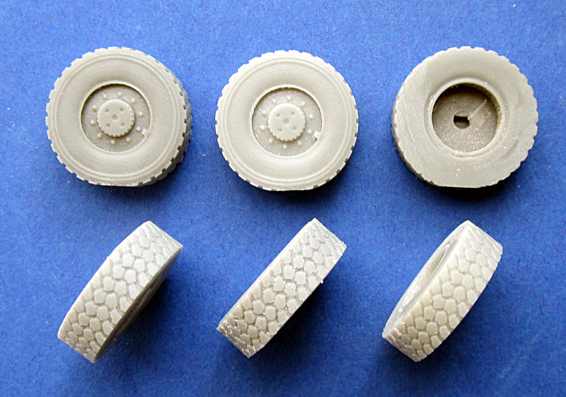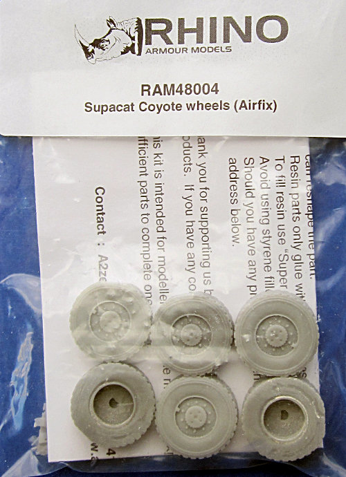 Dieser Satz bietet 6 Räder für den Supacat Coyote von Airfix. Die Räder sind einer der Schwac hpunkte der im Detail recht einfachen Airfixbausätze. Rhino bietet hier eine etwa gleichwertige Felge mit - am Anguss - abgeplatteten und leicht ausgebeulten Reifen. Rückseitig kann das Rad direkt am Modell verwandt werden. Da Highlight ist jedoch das Profil des Reifens, wodurch der Spielzeugcharakter des Airfix-Kits deutlich gemindert wird.
