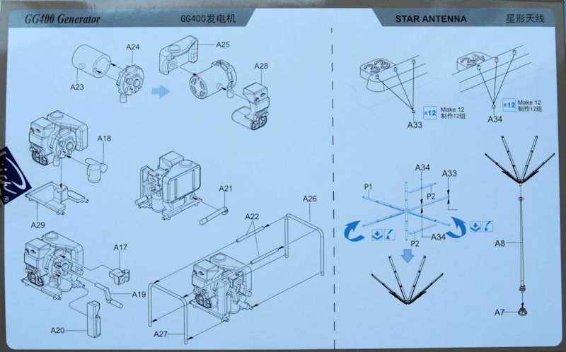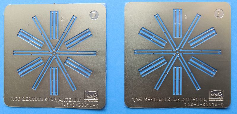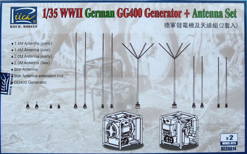 Riich Model überrascht immer wieder mit neuen und interessanten Bausätzen. So kommt hier eine Antennen Set mit kleinen Stromgeneratoren auf den Basteltisch. Auf zwei Spritzlingen befinden sich verschiedenen 1,4 und 2,0 Meter Antennen mit Sockeln, in früher und späterer Ausführung sowie zwei Sternantennen. Der Bausatz enthält auch zwei kleine Generatoren, die zur Stromversorgung von Funkgeräten benötigt werden. Für die Anfertigung der Sternantennen hat Riich zu der Spritzgussversion auch zusätzlich einen Ätzbogen beigelegt. So lässt sich die Anfertigung dieser komplizierten Antennenart leichter bewerkstelligen.