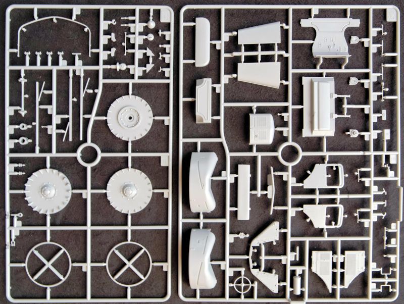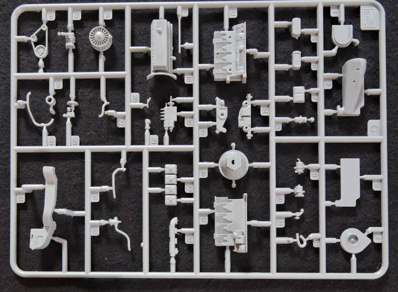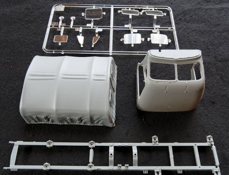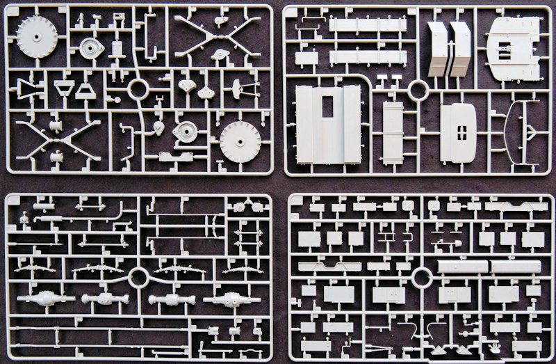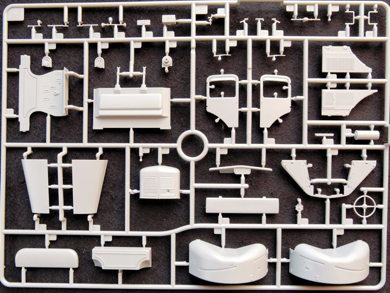 Die Aufteilung der Baustufen ist durchdacht gestaltet und verzichtet auf überflüssige Aufteilungen in winzigste Bauteile. Das ist schon bei der einteiligen Fahrerkabine festzustellen, die sogar Aussparungen für die Türen enthält, um diese, bei Bedarf, offen oder geschlossen darzustellen. Die Türen sind ebenfalls einteilig und im Innenbereich bereits vollständig gegossen.
