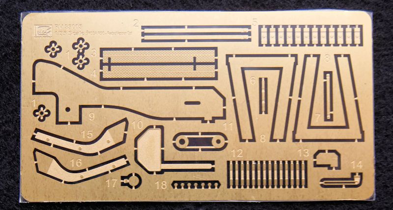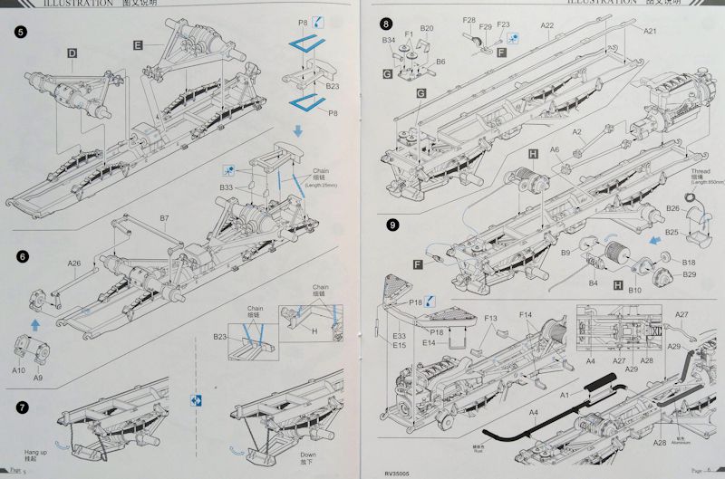 Bausatz: Der mit einem schönen Titelbild gestaltete stabile Karton stellt sich beim Öffnen als prall gefüllt dar. Sehr gut verpackte Teile lassen ein hervorragendes Modell vermuten. Der Bausatz enthält acht Spritzlinge, plus separat verpackter Klarsichtteile, Rahmen, Reifenringe, Pläne und einteiliger Fahrerkabine. Dazu liegen ein sinnvoller Ätzteilbogen, Gliederkette, Seil und ein hochwertiger Decalbogen bei. Auf diesem sind sogar die Anzeigen der Armaturen im Fahrerhaus enthalten. Die Bauanleitung ist in Heftform gehalten und erinnert am Design und der Symbole sehr stark an die von Dragon.