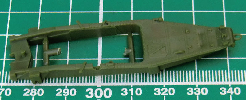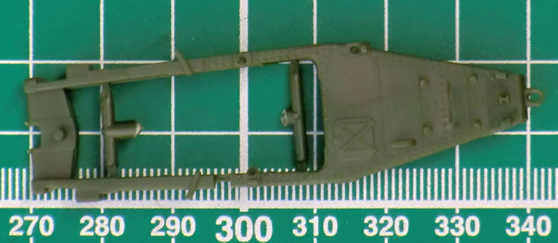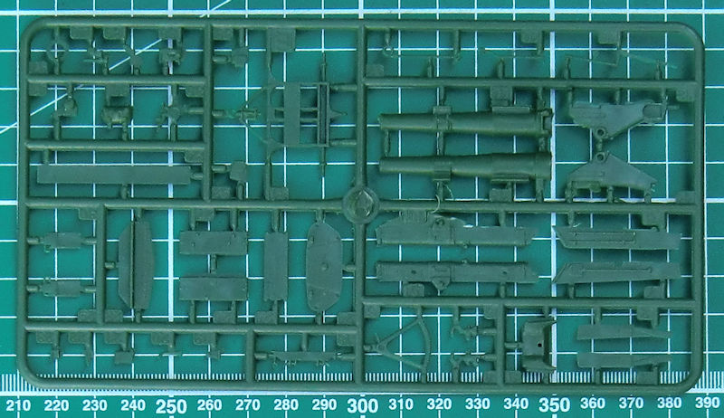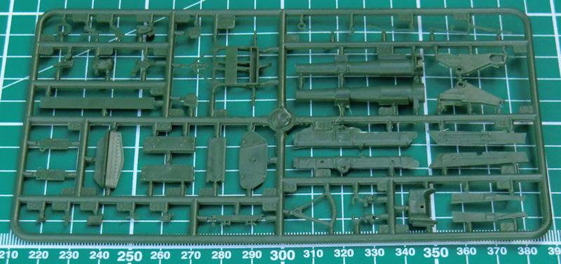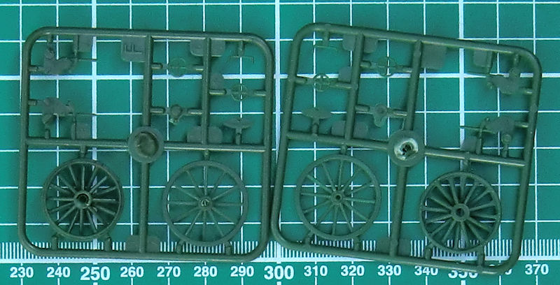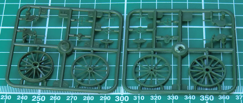 Die Teile sehen an den Spritzlingen sehr gut aus. Es irritieren allerdings die Grummi-Randreifen für die beiden Räder des Geschützes. Bei der Protze müssen keine aufgezogen werden. Weiter geht es mit dem Bau der Lafette. Hier gibt es immerhin ein Großbauteil und daher muss hier nichts ausgerichtet werden. Das wird dann allerdings beplankt.