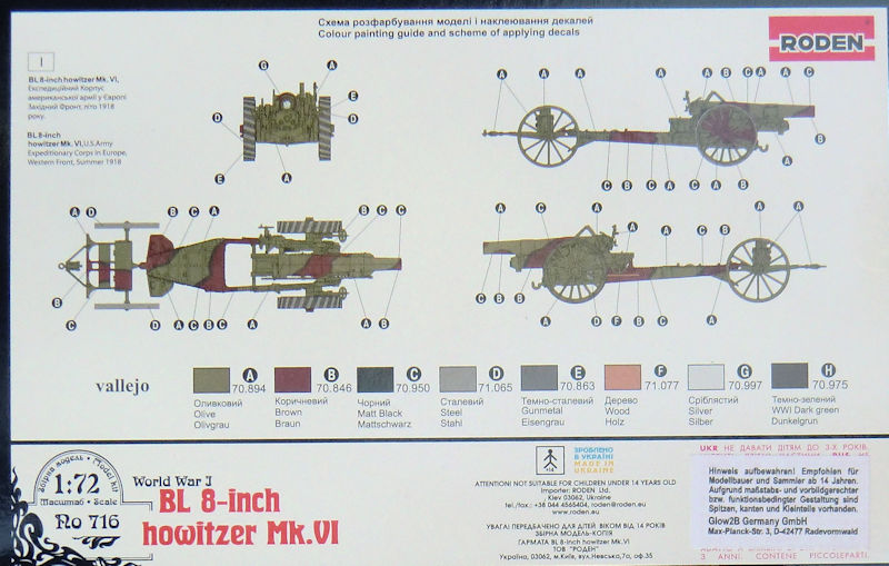 Bausatz: Roden liefert hier in 1/72 erneut einen Beitrag zum Thema WK I. So gibt es jetzt die Vickers 8-inch Haubitze Mk. VI. In der attraktiven aber unpraktischen Schüttbox befinden sich gut verpackt vier grüne Spritzlinge mit insgesamt 69 Teilen, zwei schwarze Gummiteile, eine Bauanleitung und die mehrfarbige Bemalungsanleitung.