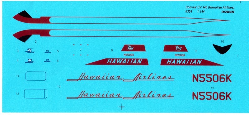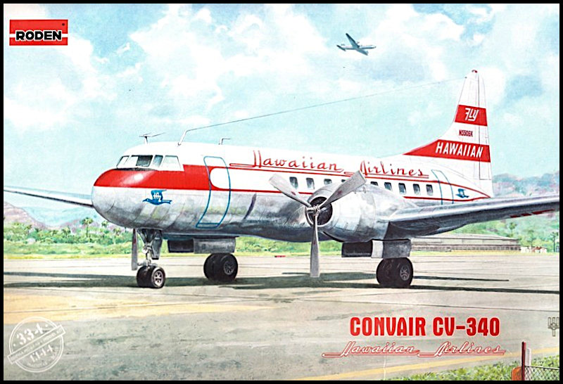 Modell: Auf diesen Typ haben sicherlich viele Modellbauer gewartet. Gänzlich unbesetzt war das Thema der Convairliner in 1:144 bisher nicht. So gab/gibt es Vacubausätze bei Welsh Models und den Resinbausatz bei Authentic Airliners. Nun hat Roden einen Plastikspritzguss-Kit auf den Markt gebracht. Dabei handelt es sich um einen sogenannten Short-Run Bausatz. Die Qualität sieht auf den ersten Blick aber sehr gut aus. Die oben im Vorbildteil vorhandene Beschreibung zur CV-440 hat seinen Grund, denn im Kasten ist im Prinzip eine 440er enthalten. Dennoch liegt Roden mit der Bezeichnung CV-340 nicht unbedingt falsch, da auch das gewählte Vorbild der Hawaiian Airlines ursprünglich mal als 340er ihr Leben begann und später auf den neueren Standard aufgerüstet wurde. Den Fakt, das also eine 440er im Kasten sich befindet, sollten Käufer, welche andere Decalsätze nutzen wollen, bedenken.