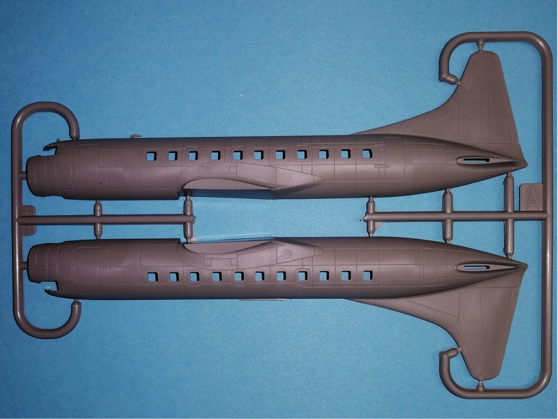 Aber zurück zu den Teilen. Nach dem Öffnen des attraktiven Stülpkartons sieht man die drei Spritzlinge aus grauen Kunststoff und einen Rahmen aus klarem. Der Bausatz folgt der üblichen Aufteilung der Hauptbaugruppen wie Rumpf und Tragflächen. Etwas über 40 Bauteile müssen für das fertige Modell zusammengefügt werden. Beim Betrachten fallen die gleichmäßigen Gravuren ins Auge, welche zunächst etwas kräftig wirken. Unter den Lackschichten wird sich bestimmt dieser Eindruck relativieren. Wenn man sich den Rumpf anschaut, kann man gleich eine deutliche Verbesserung gegenüber früheren Kits des Herstellers wahrnehmen. Es sind nämlich auch offene Passagierfenster vorhanden. Frühere Bausätze von Roden hatten oft eine Mischung von klaren Cockpitfenstern und geschlossene für die Kabine. Zum Verschließen sind Streifen mit den Paxfenstern vorhanden. Leider sind die beiden Antennen auf den Rumpf mit angegossen. Diese werden sicherlich während des Baues abbrechen.