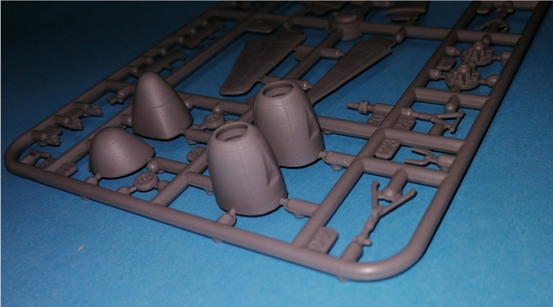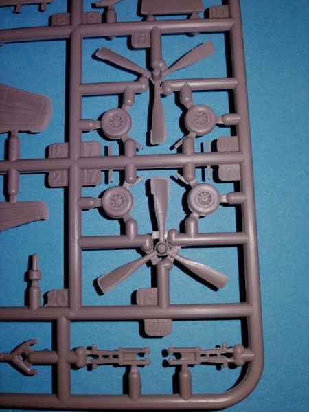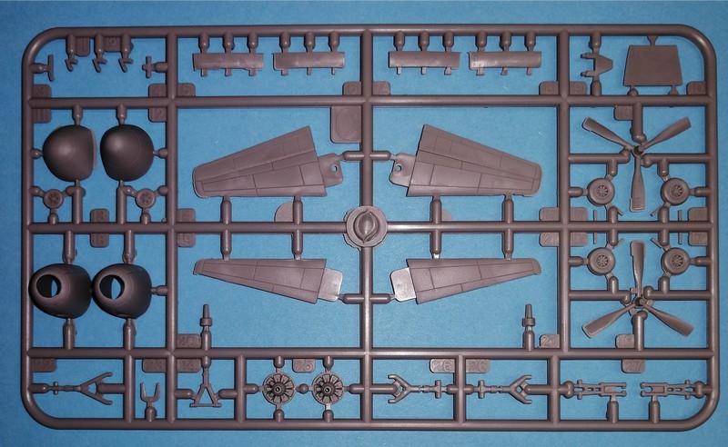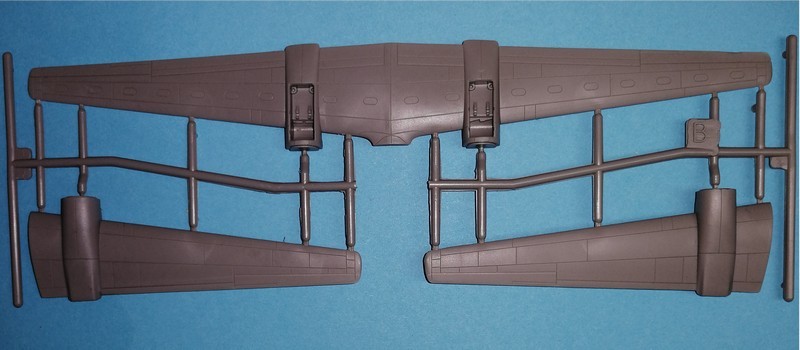 Für die Nase gibt es im Kasten die kurze Variante oder die längere Ausführung mit Radar. Ein Innenleben, sprich Cockpit oder gar eine Kabine gibt es nicht. Die Tragflächen entstehen aus einem durchgehenden unteren Stück, welche mit den beiden oberen Stücken komplettiert wird. Die Hinterkannte ist dabei zweiteilig, wobei Roden sich aber Mühe gegeben hat, diese so dünn wie möglich zu gestalten. Die beiden Motoren entstehen aus dem den beiden jeweils einteiligen Verkleidungen und einer Platte mit der ersten Reihe des 18-Zylindersternmotors. Dies ist in diesem Maßstab völlig ok. Die beiden Propeller sind die Varianten mit gerade Blattspitzen. Sie müssen noch etwas von Fischhaut befreit werden, was aber kein großes Problem ist.