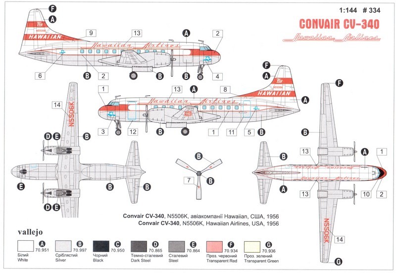 Vorbild: Die Convair CV-340 (auch als Convair 340 bzw. Convairliner 340 bezeichnet) ist ein zweimotoriges Passagierflugzeug des US-amerikanischen Flugzeugherstellers Convair mit Kolbentriebwerken. Der Erstflug der Kurzstrecken-Maschine fand am 5. Oktober 1951 statt. Der Tiefdecker wurde nach neuen Forderungen seitens der United Air Lines aus der Convair CV-240 weiterentwickelt. Zwei Türen mit eingebauter Treppenanlage verringerten die Abhängigkeit von Bodeneinrichtungen und beschleunigten die Passagierabfertigung. Gegenüber dem Ausgangstyp wurde die Kabine um 1,37 Meter verlängert. Diese Verlängerung wurde für eine zusätzliche Sitzreihe verwendet. Die Convair CV-340 bot damit 44 Passagieren in 11 Sitzreihen Platz. Auch der Tragflügel und das Seitenleitwerk wurden verändert. Insgesamt wurden 209 Maschinen dieses Typs an Fluggesellschaften verkauft, 37 gingen an private Betreiber. Damit war der Typ wirtschaftlich erfolgreich. Das Muster blieb bei den großen Fluggesellschaften bis etwa Mitte der 1960er Jahre im Einsatz, um dann den aufkommenden modernen Kurzstreckenjets wie der Boeing 737 zu weichen. Die Lufthansa beschaffte 1954 vier Maschinen dieses Typs und nutzte sie bis 1968. Viele Maschinen, auch die der Lufthansa, wurden mit Hilfe eines von Convair gelieferten Umrüstsatzes zu Convair CV-440 umgerüstet.