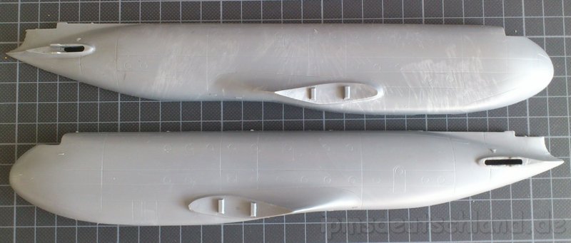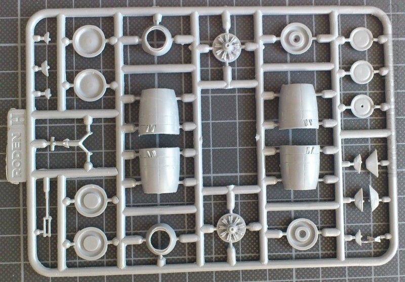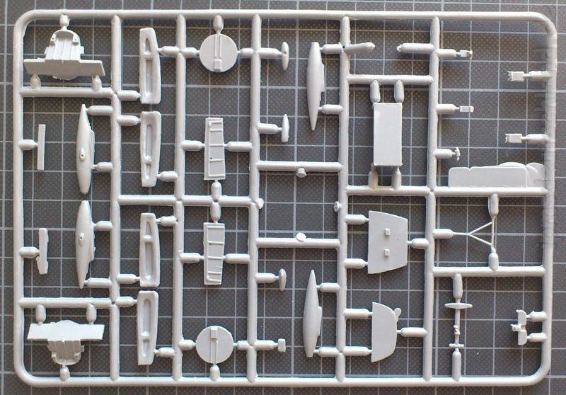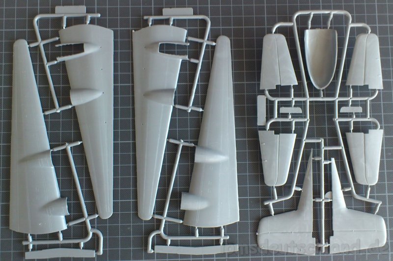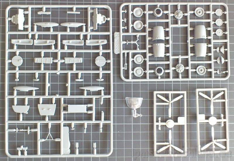 Das Modell: Es handelt sich um einen sauber gespritzten Spritzgussbausatz. Feine Gravuren geben dem Modell eine schöne Struktur. Die Fensteröffnungen sind nur durch Gravuren angedeutet und werden letztlich per Decal dargestellt. Da diese im Original rund sind, können sie vom erfahrenen Modellbauer sicher aufgebohrt werden, wenn dies gewünscht ist. Das Cockpit liegt als Haubenteil in Klarsichtplastik vor. Innereien gibt es keine, die Frachttore müssten ebenfalls in Eigenregie erstellt werden. Wie bei einigen Herstellern aus dem Osten üblich, fehlen Passzapfen. Die Montage muss also sehr gewissenhaft erfolgen. Die Decals sind rudimentär. Details gibt es keine.