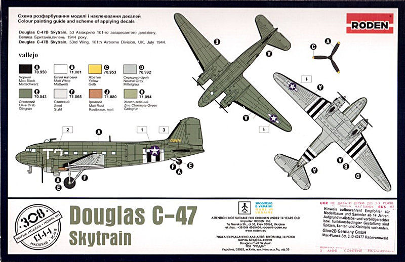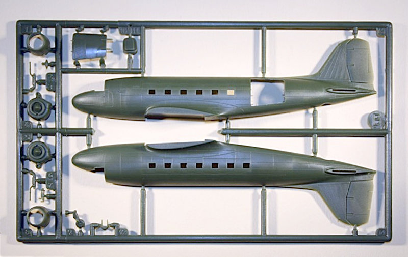 Bausatz: Offenbar bearbeitet man bei Roden konsequent das Thema der Propellerflugzeuge aus dem Hause Douglas. Nun ist auf dem Markt die C-47(DC-3) erschienen. Bisher gab es für die 144er Freunde in Spritzguss von Minicraft mehrere Auflagen als C-47 oder DC-3 durch die Beilage von Decals für Transportmaschinen oder Airlines. Dieser Kit stammt allerdings auch schon aus dem Jahre 1995 und hat so einige Schwächen in der Formgebung, z.B. wie so oft bei Modellen im Bereich der Nase.